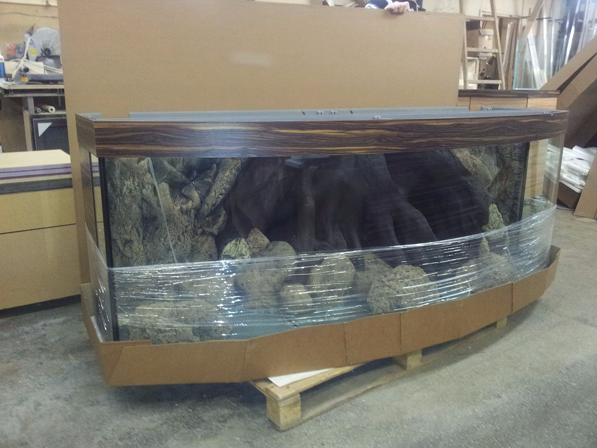 Оцените качество нашей упаковки на примере панорамного аквариума объёмом 900 литров с тумбой: Аквариум(2010х710х750h)-12мм.