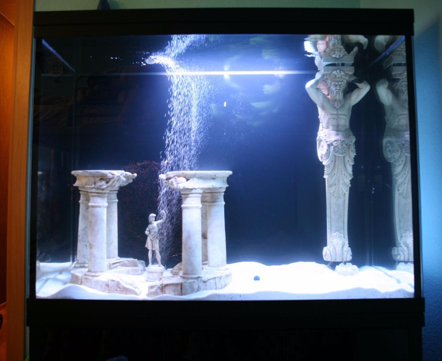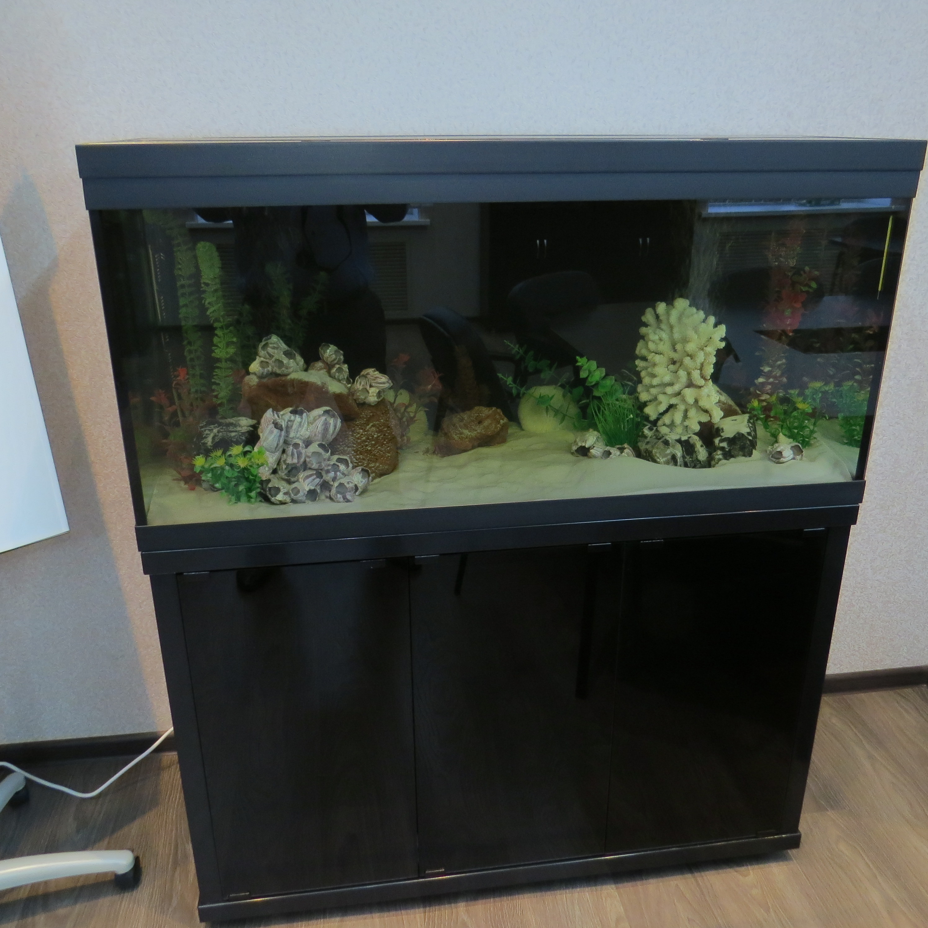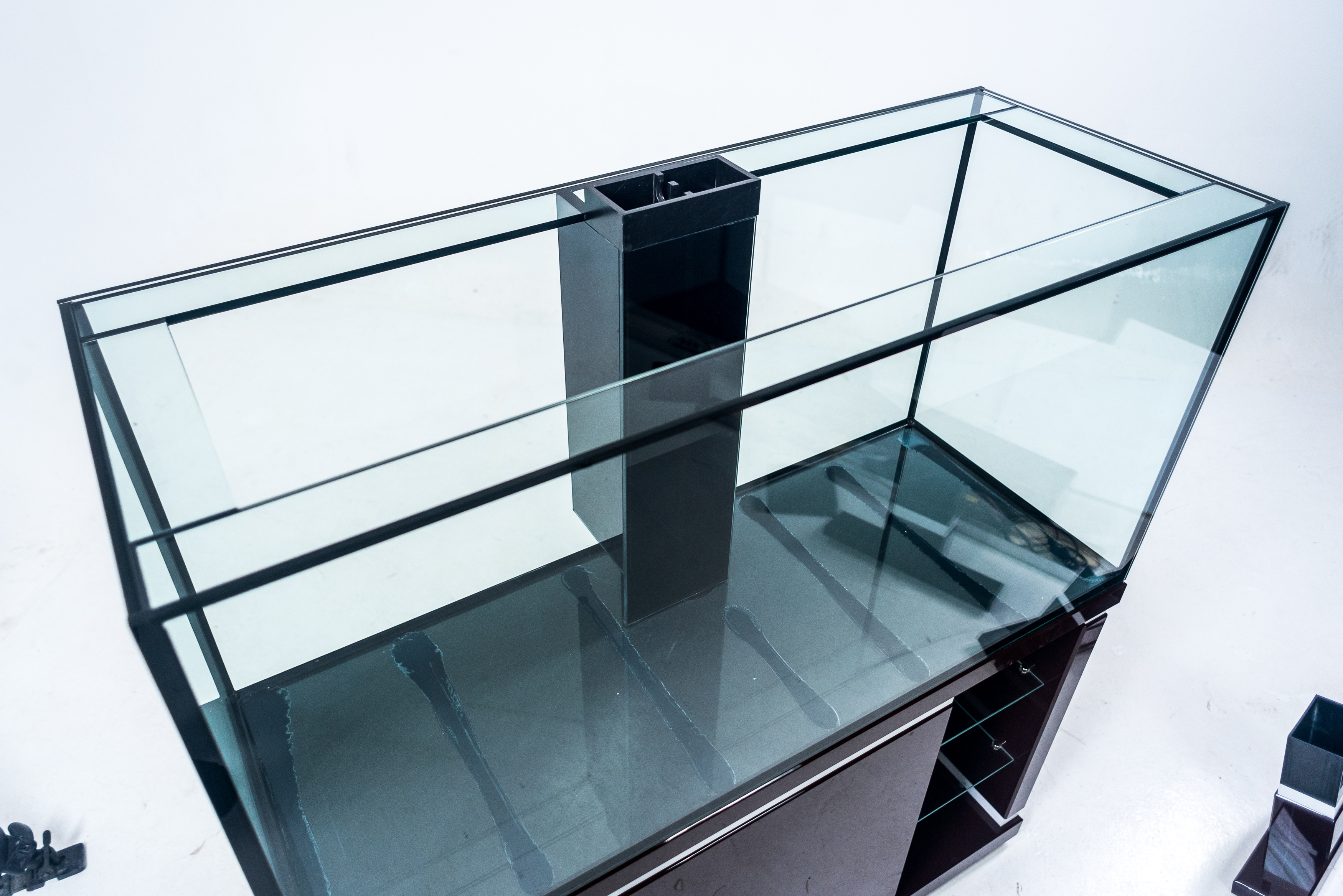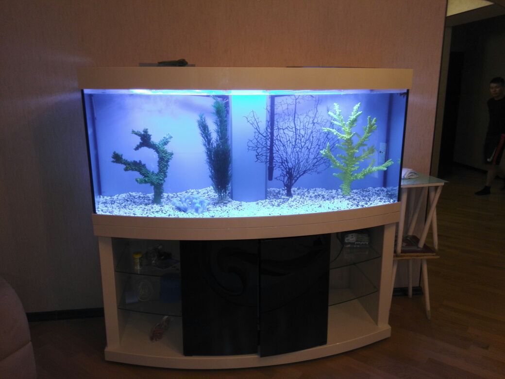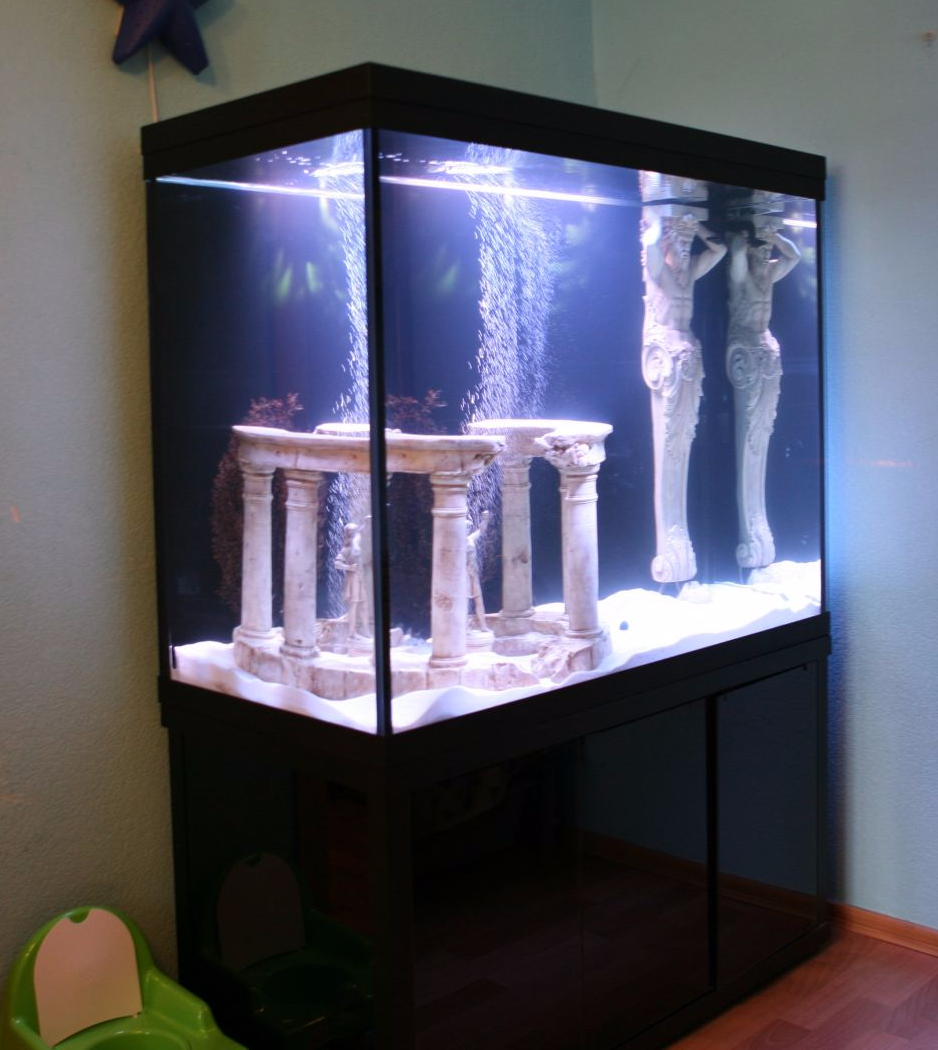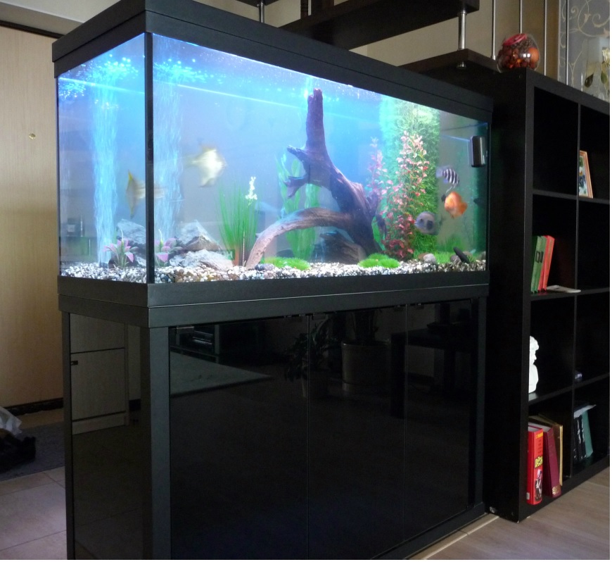 Но бывает так, что аквариум необходимо установить вплотную к стене без зазора или с минимальным зазором или встроить  между стенами, или даже поставить в центре помещения.