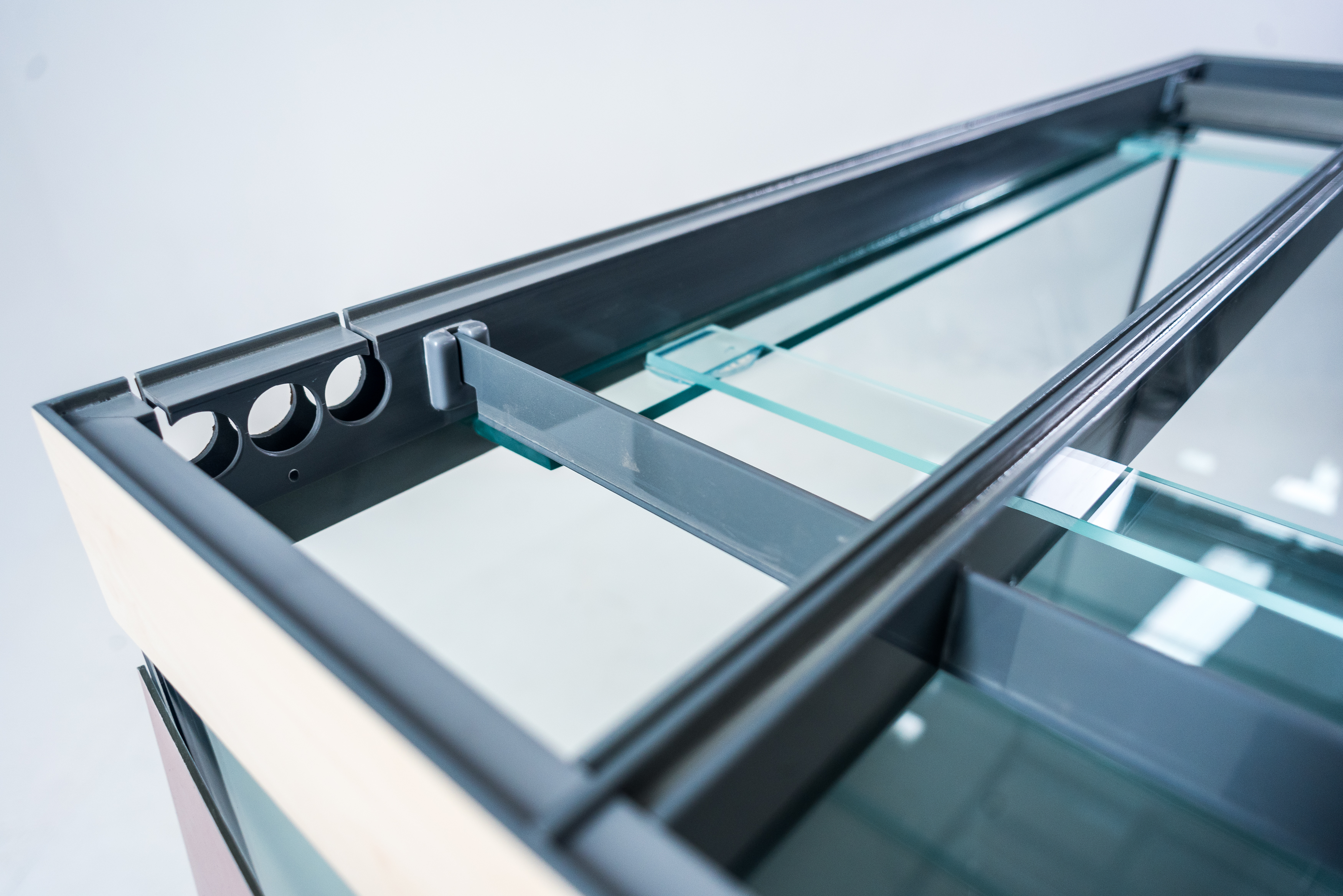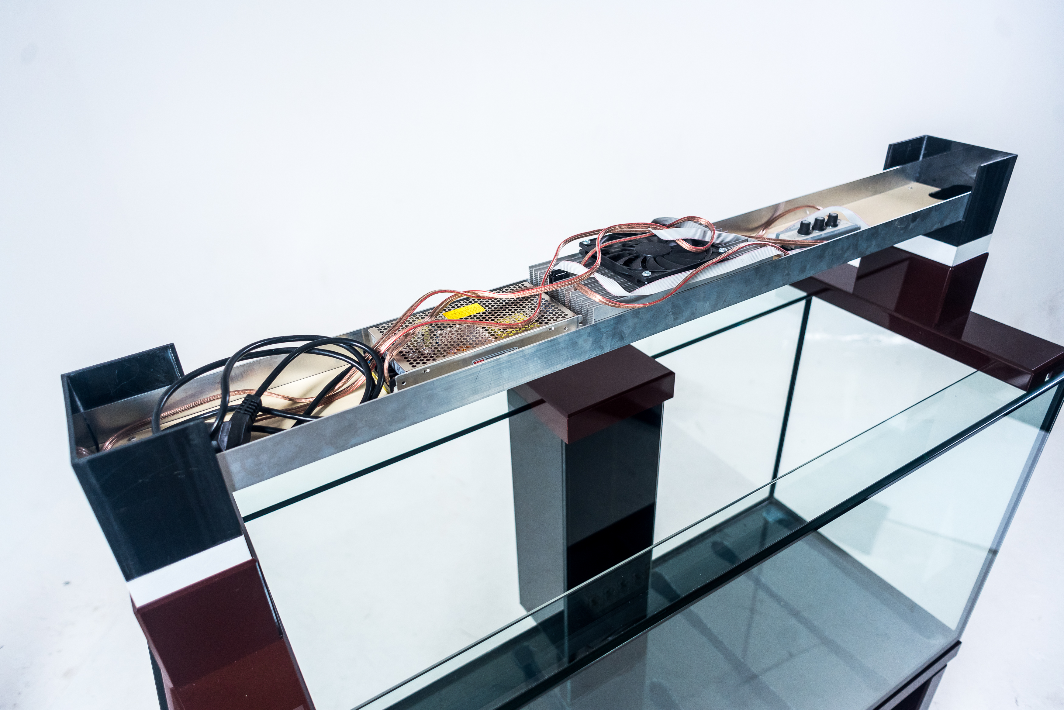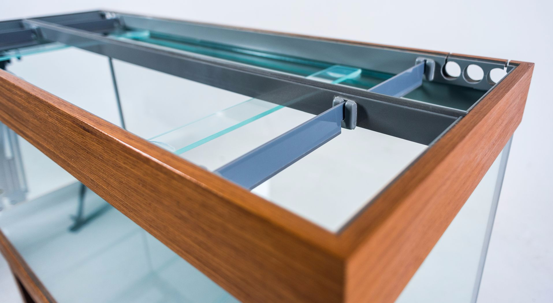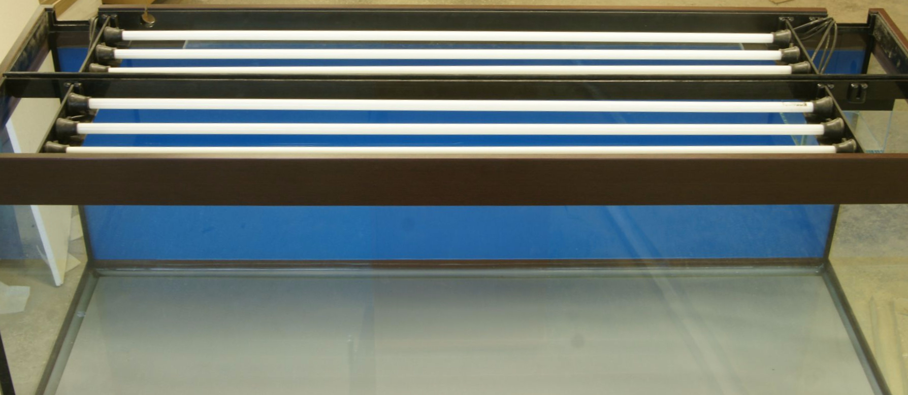 Надёжный жёсткий корпус светильника высотой 85 или 100 мм. герметично приклеивается к основанию аквариума с усадкой по стеклу 50 мм. Поверх корпуса устанавливаются съёмные крышки из алюминиевой сэндвич-панели, а передние крышки фиксируются в вертикальном положении и комплектуются ручками. Центральная планка, так же как и уголки для размещения ламп, съёмная. Например, на аквариум длинной 1300 мм вы сможете заказать размещение уголков для ламп 105 см. и для ламп 120 см., либо заказать вклейку дополнительных держателей для уголков ламп, что позволит устанавливать лампы и 105 см. и 120 см. Лампы свободно перемещаются по уголкам и не касаются стяжек аквариума. При установке отражателей на лампы, крышка так же плотно закрывается. В задней части корпуса предусмотрены технологические отверстия под оборудование: круглые или квадратные выпилы.