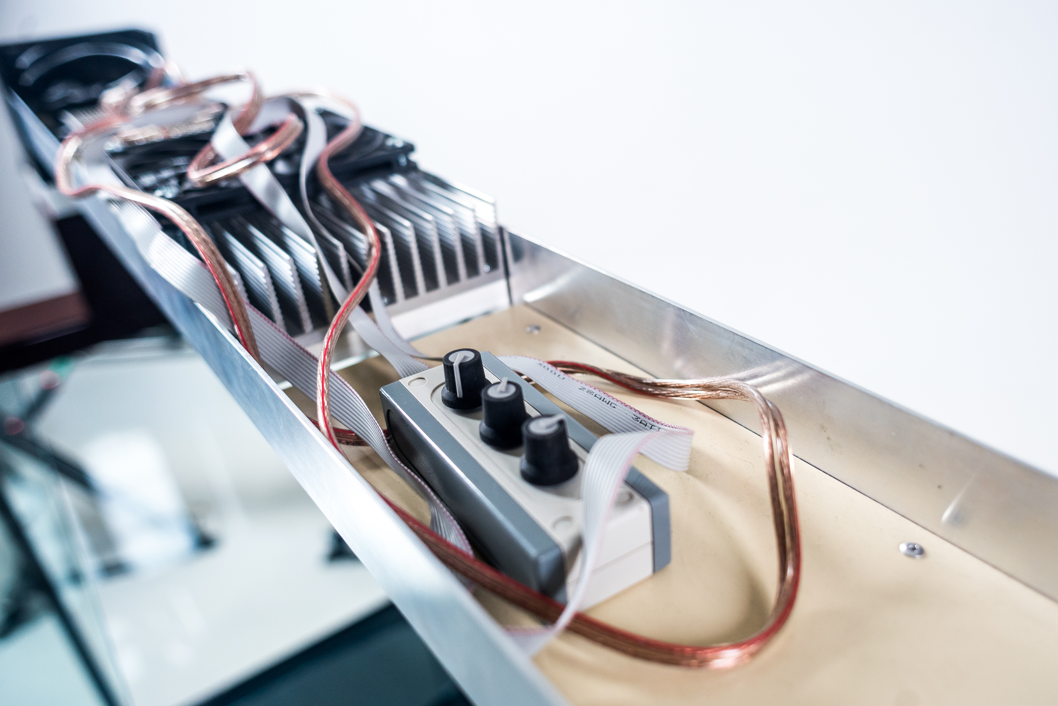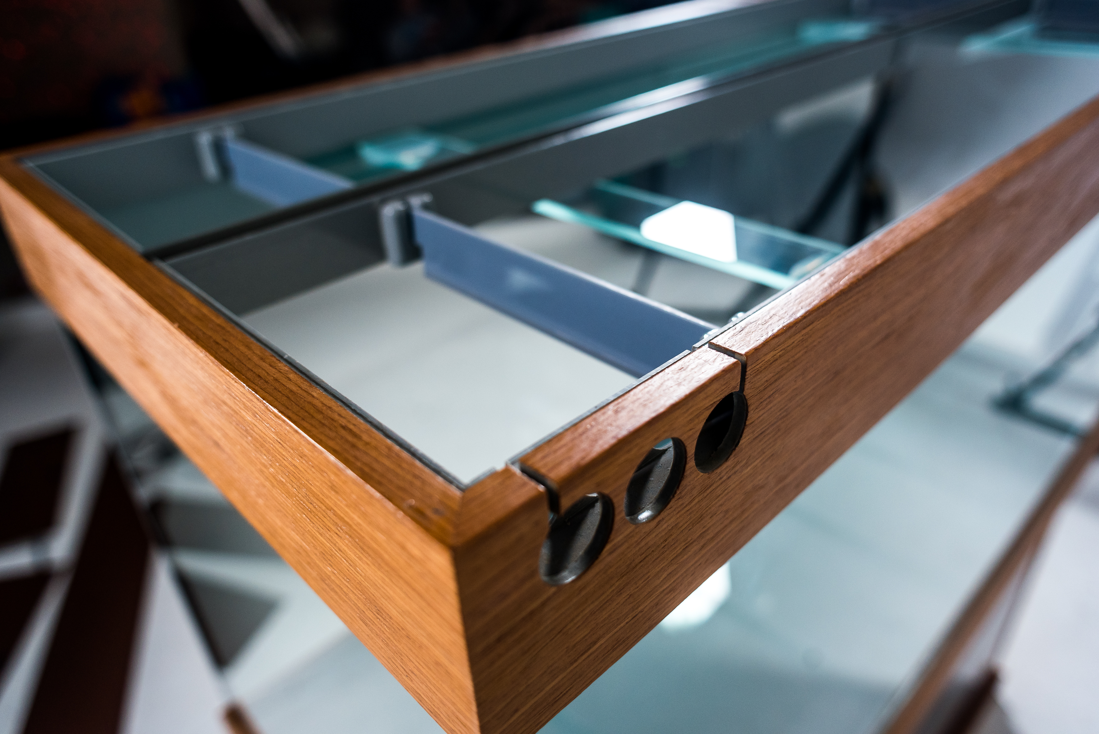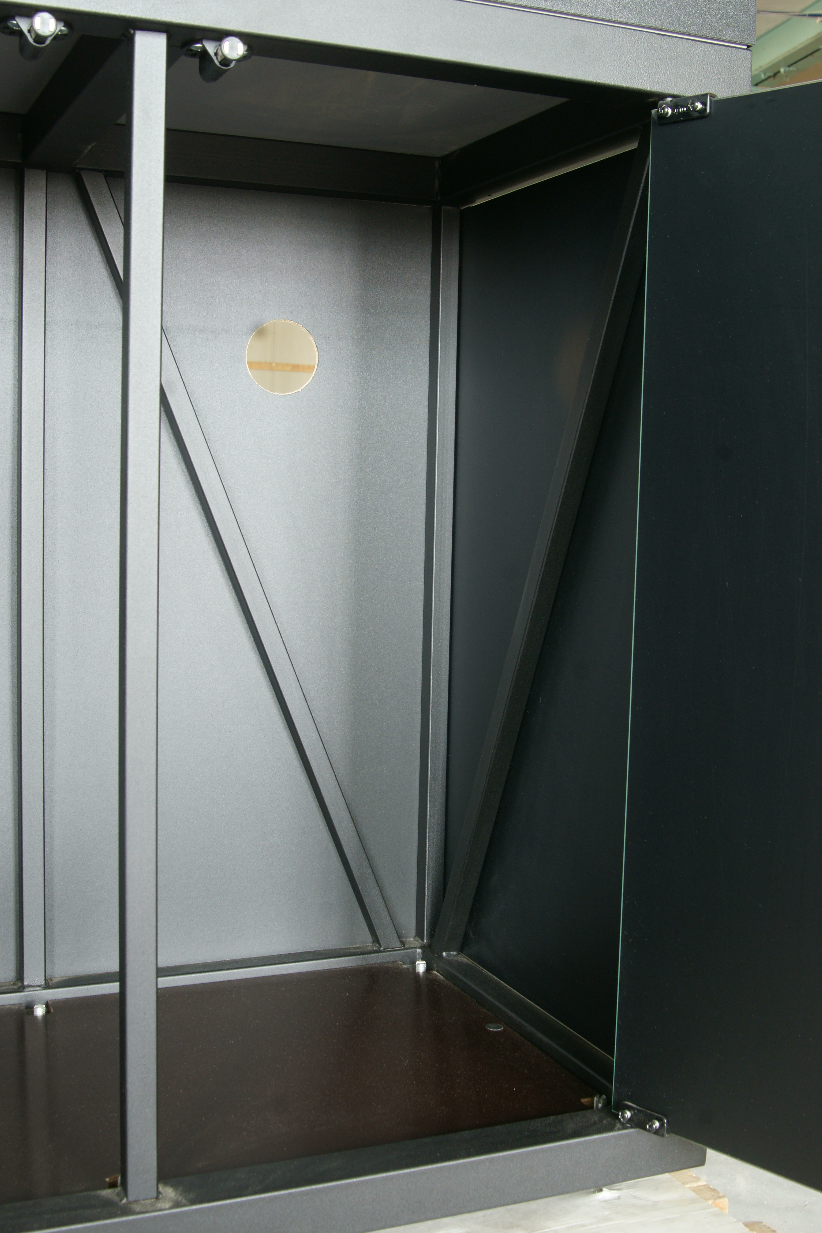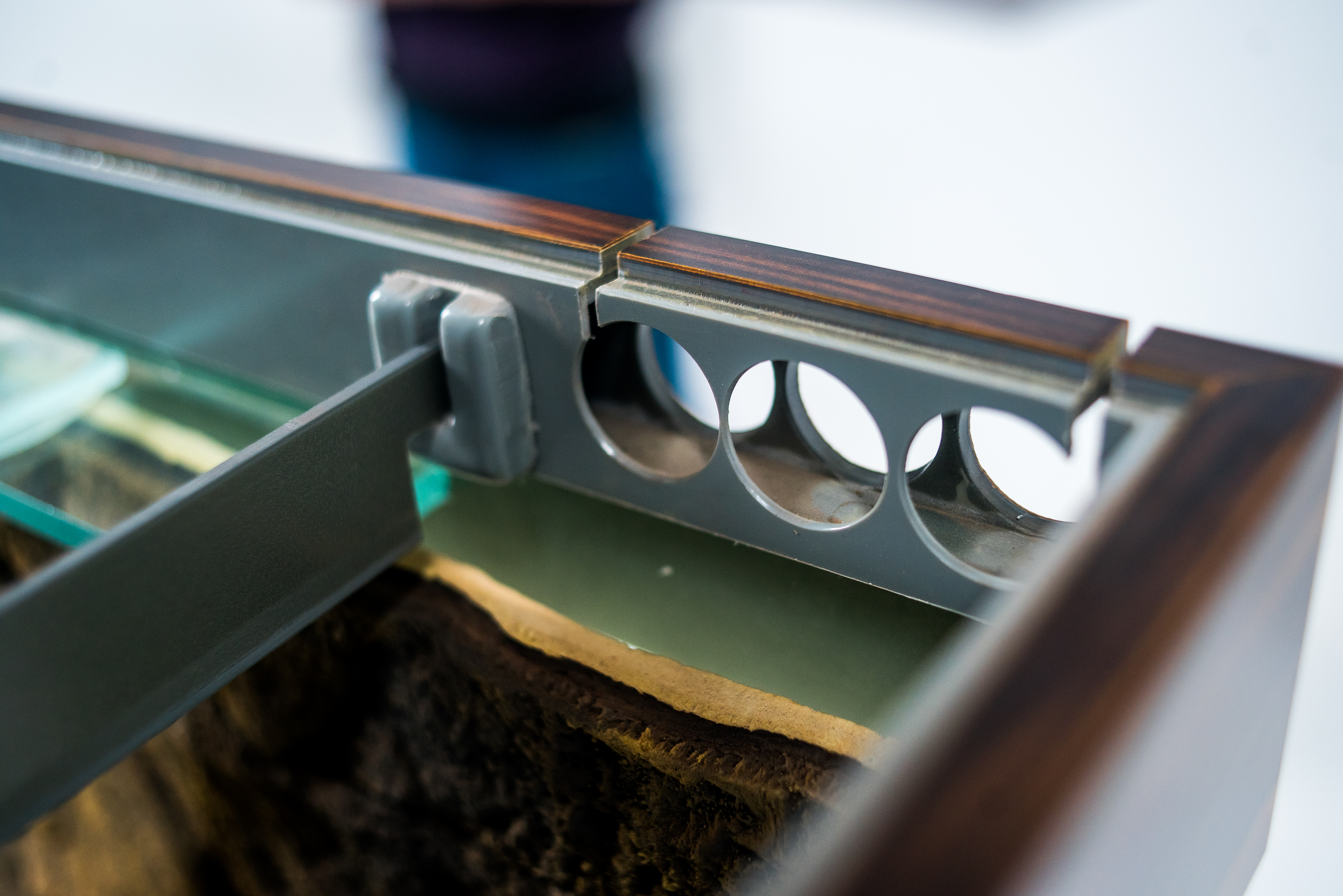 Надёжный жёсткий корпус светильника высотой 85 или 100 мм. герметично приклеивается к основанию аквариума с усадкой по стеклу 50 мм. Поверх корпуса устанавливаются съёмные крышки из алюминиевой сэндвич-панели, а передние крышки фиксируются в вертикальном положении и комплектуются ручками. Центральная планка, так же как и уголки для размещения ламп, съёмная. Например, на аквариум длинной 1300 мм вы сможете заказать размещение уголков для ламп 105 см. и для ламп 120 см., либо заказать вклейку дополнительных держателей для уголков ламп, что позволит устанавливать лампы и 105 см. и 120 см. Лампы свободно перемещаются по уголкам и не касаются стяжек аквариума. При установке отражателей на лампы, крышка так же плотно закрывается. В задней части корпуса предусмотрены технологические отверстия под оборудование: круглые или квадратные выпилы.
