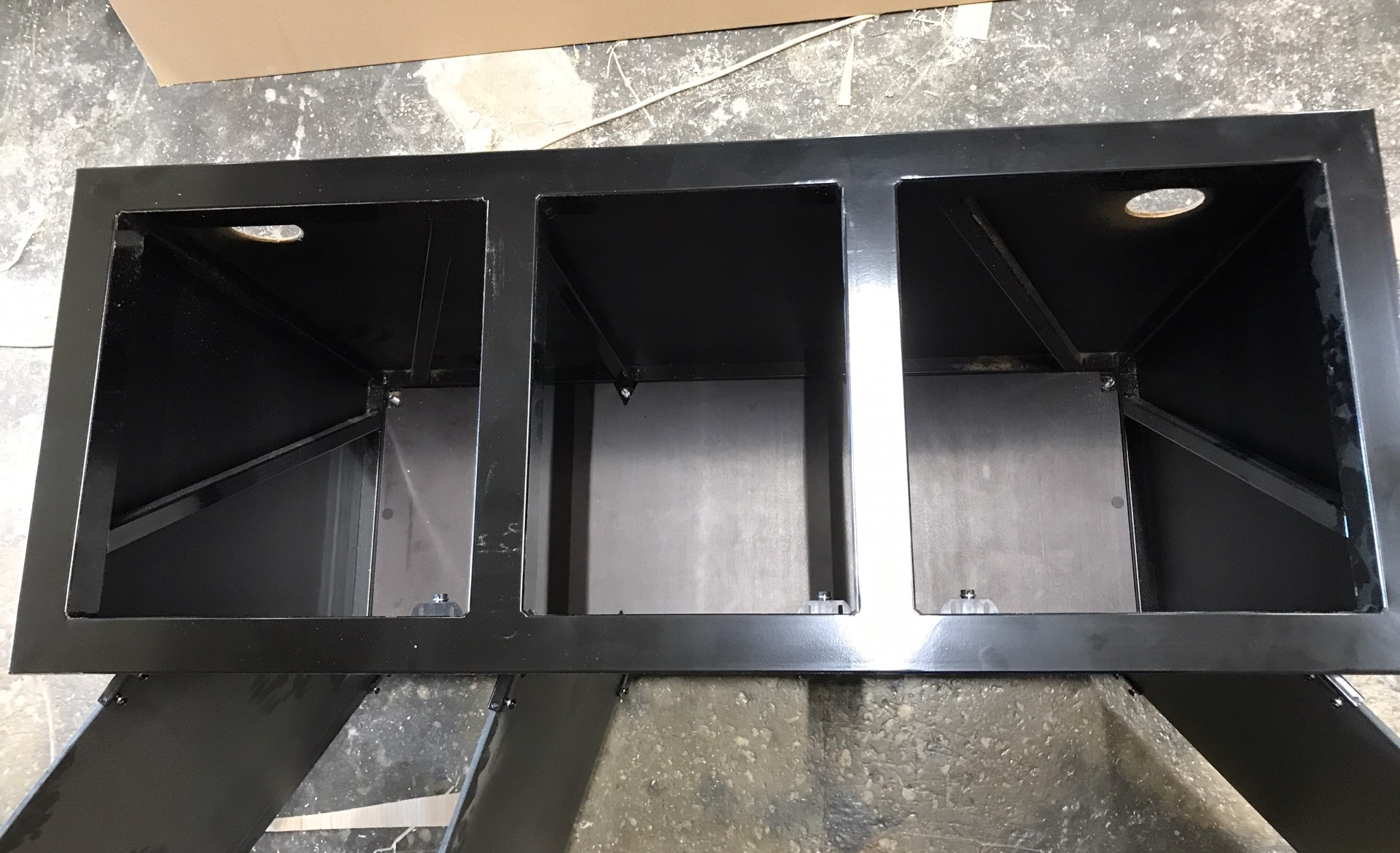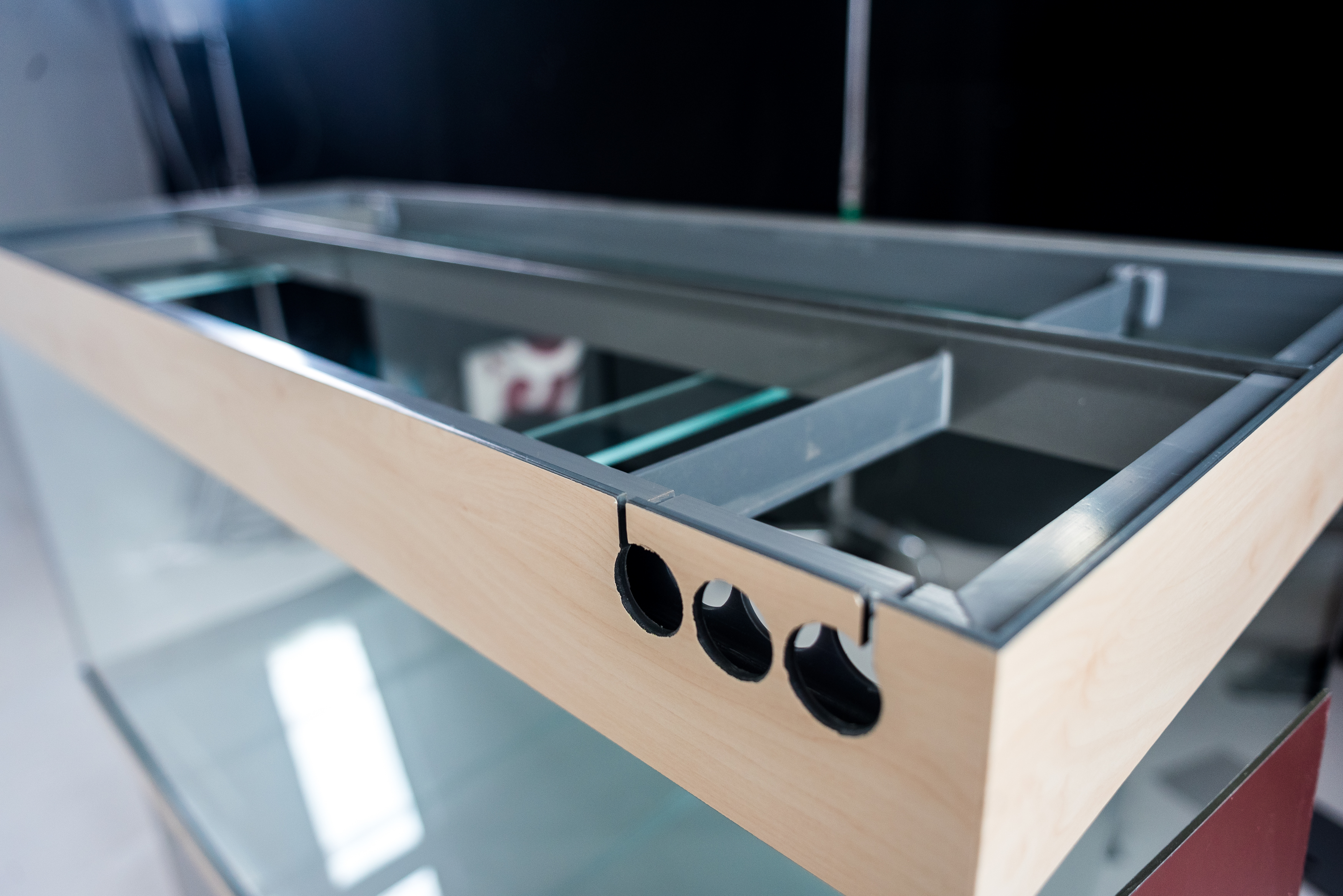 отверстия в шахтах всегда круглые нужного диаметра (максимальный диаметр 60 мм. Так же учитывайте, что расстояние от кромки стекла до начала отверстия (возьмём центр аквариума у задней стенки) в стекле 50 мм. Если у вас тумба на металлическом каркасе, то отступ от 50 до 70 мм, чтобы не попасть в каркас. Поверх аквариума устанавливаются рёбра толщиной 70 мм.