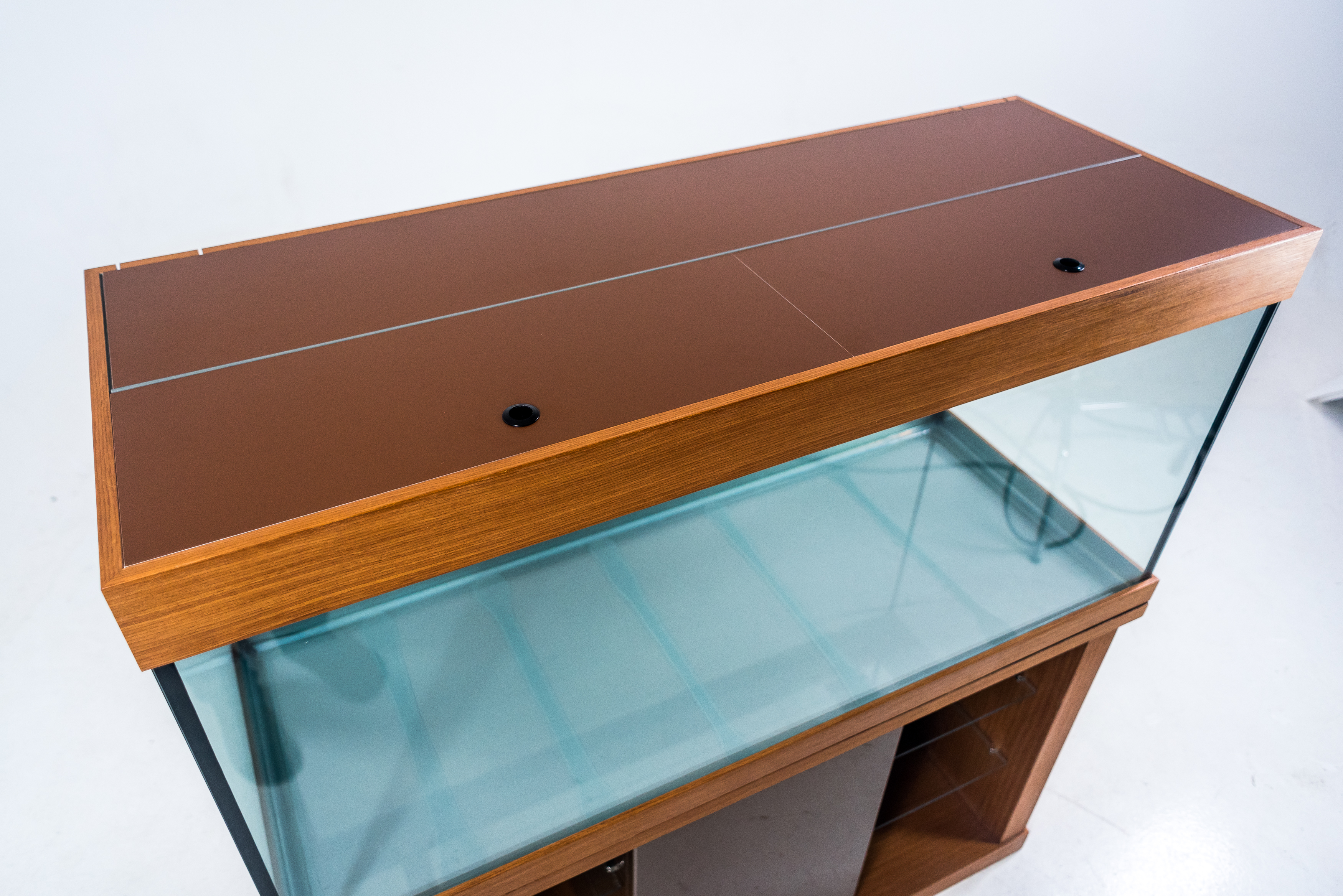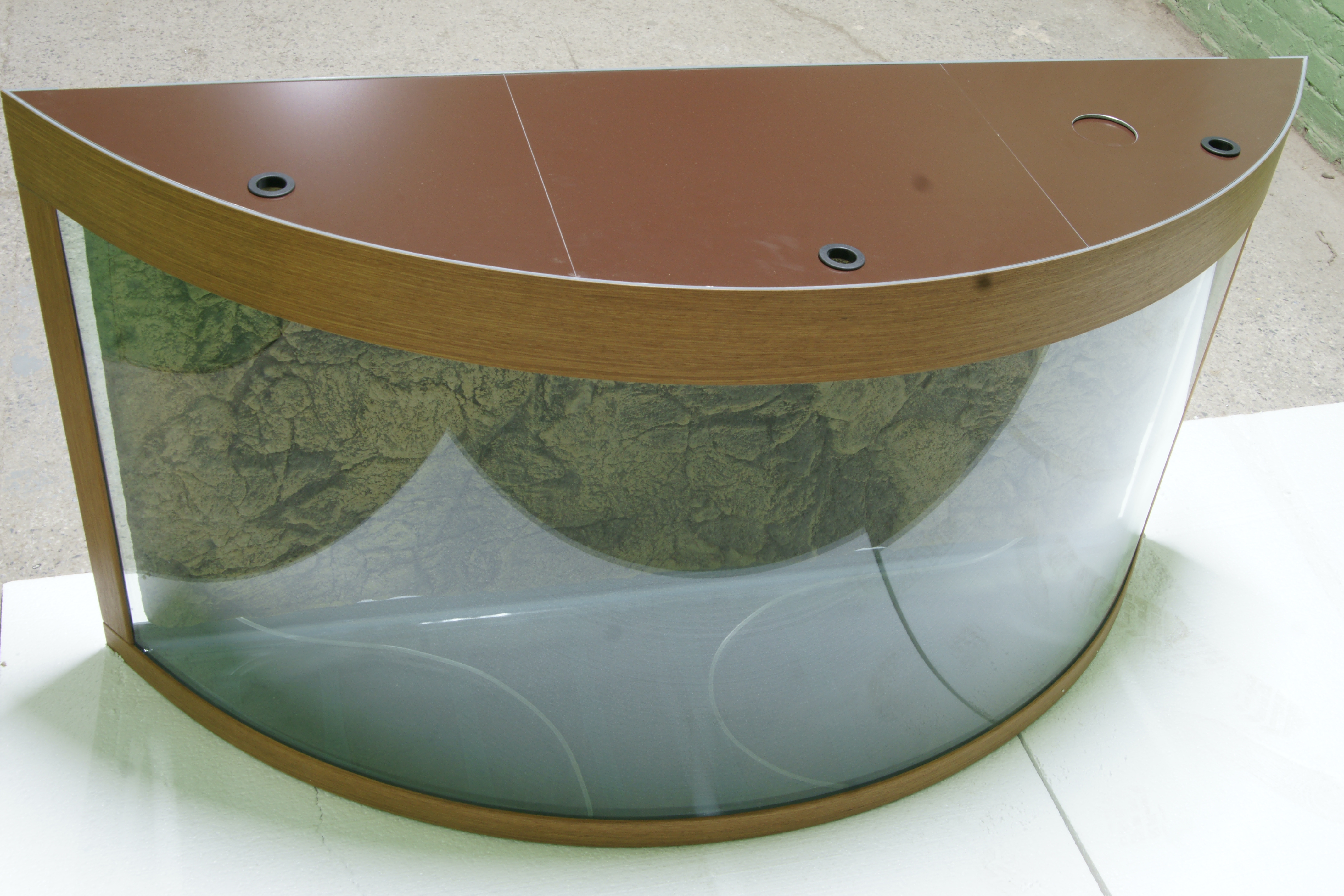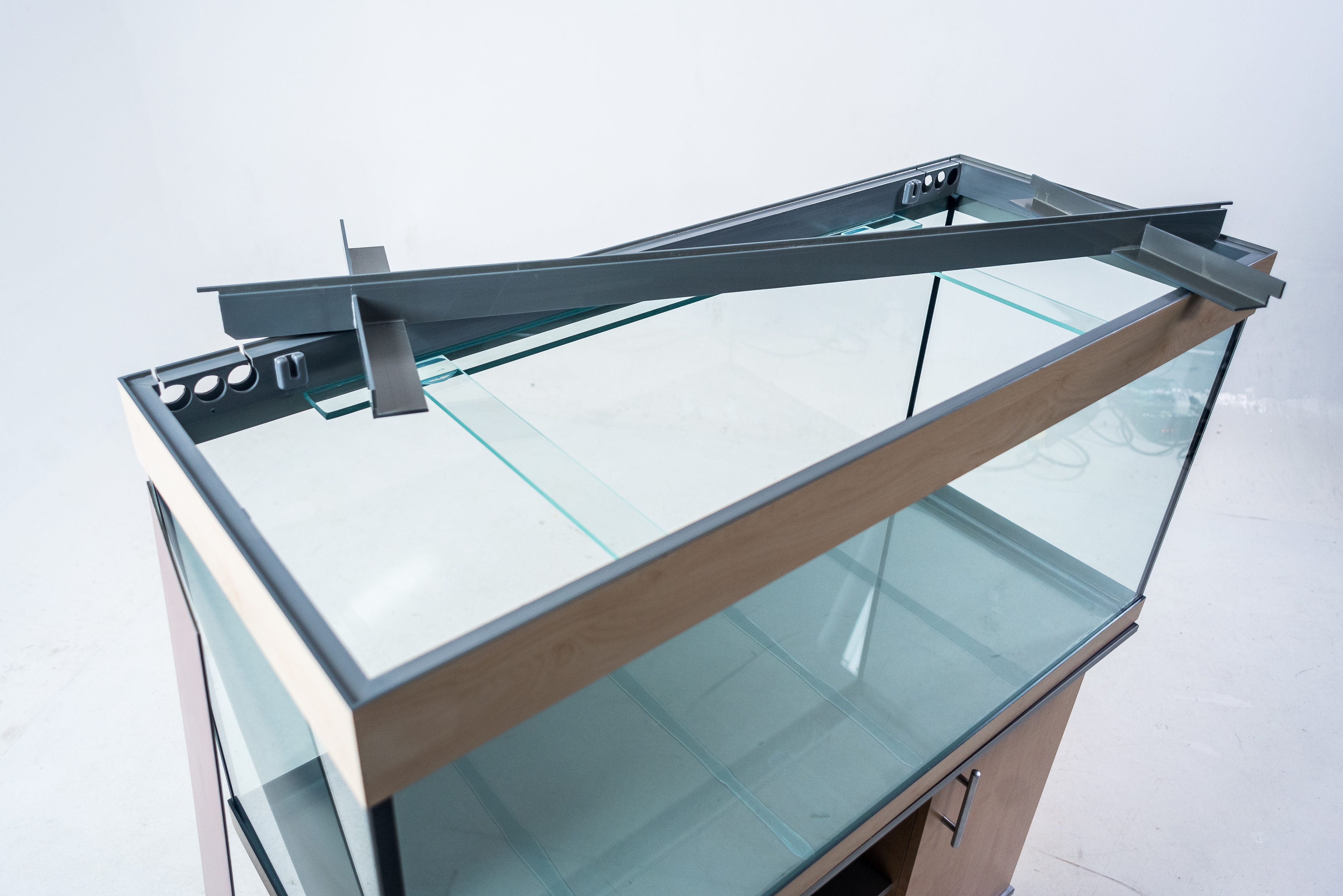 • ВОЗМОЖНО СДЕЛАТЬ «ПРЯМУЮ» КРЫШКУ, КОТОРАЯ БУДЕТ ПОВТОРЯТЬ КОНТУРЫ АКВАРИУМА (ПРОДОЛЖАЯ ВЫСОТУ СТЕКЛА БЕЗ ВЫСТУПОВ) ДЛЯ ОБТЯЖКИ ПОД МЕБЕЛЬ В ВАШЕМ СТИЛЕ или другими отделочными материалами.