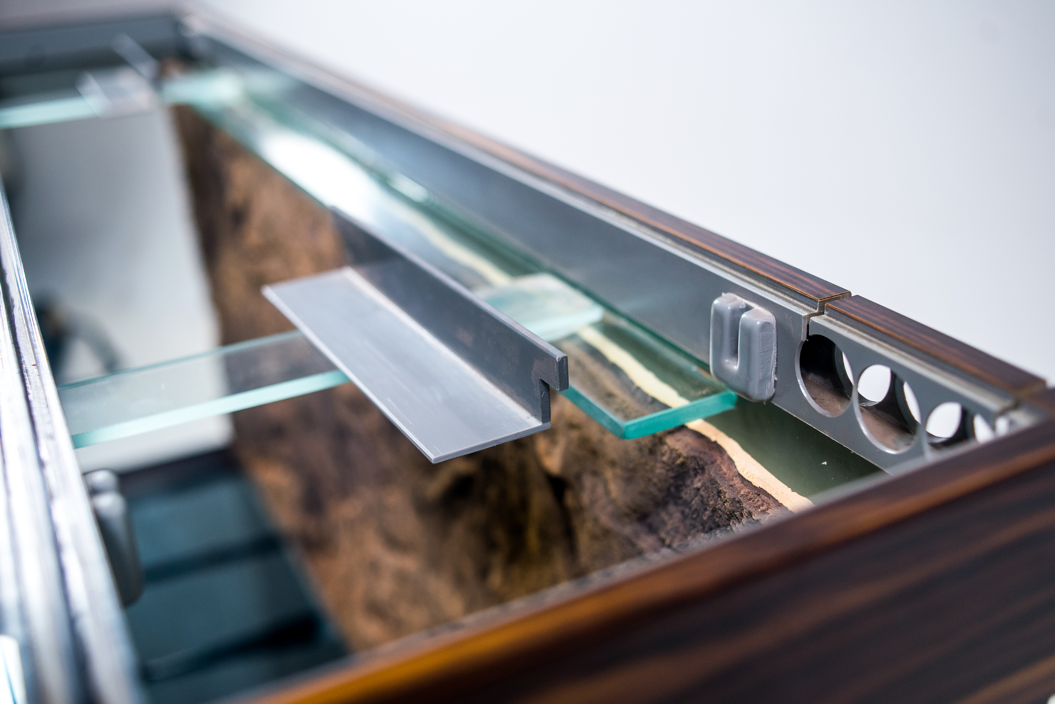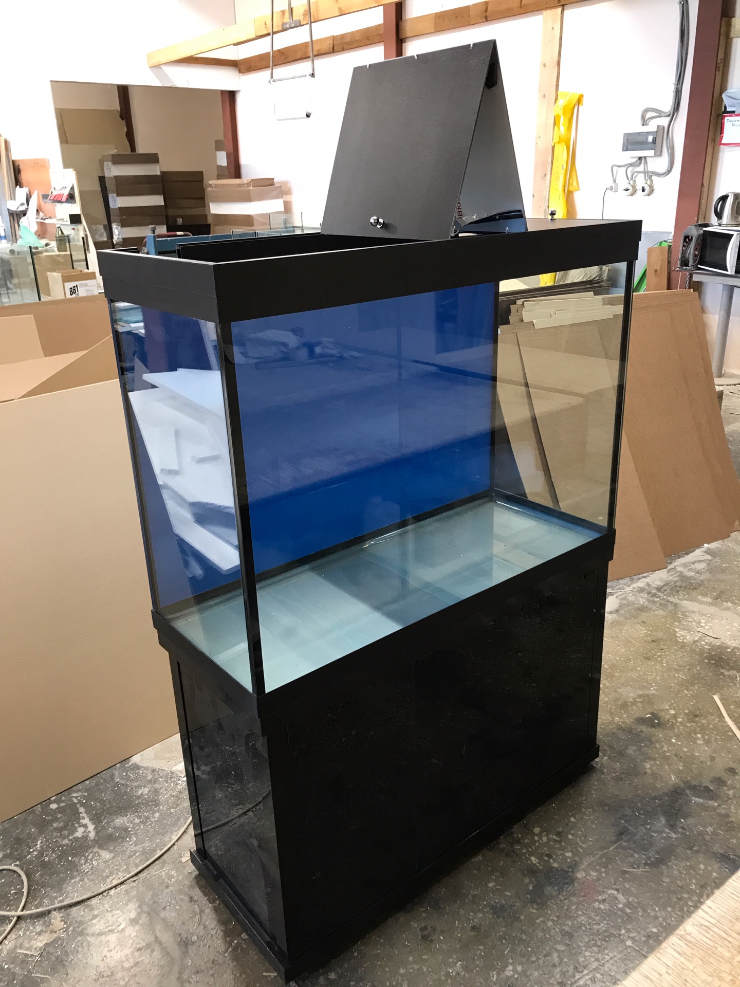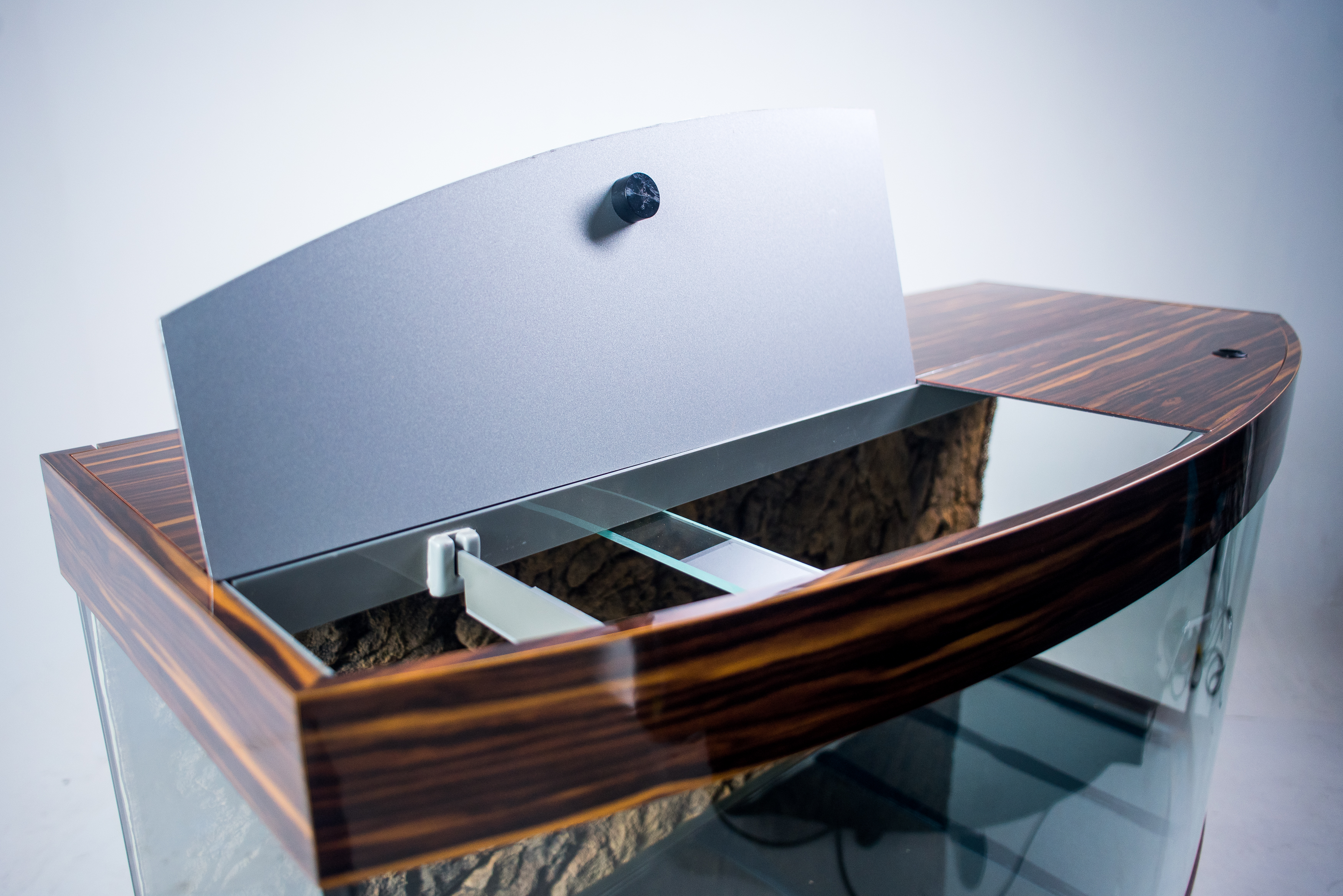 • ВОЗМОЖНО СДЕЛАТЬ «ПРЯМУЮ» КРЫШКУ, КОТОРАЯ БУДЕТ ПОВТОРЯТЬ КОНТУРЫ АКВАРИУМА (ПРОДОЛЖАЯ ВЫСОТУ СТЕКЛА БЕЗ ВЫСТУПОВ) ДЛЯ ОБТЯЖКИ ПОД МЕБЕЛЬ В ВАШЕМ СТИЛЕ или другими отделочными материалами.