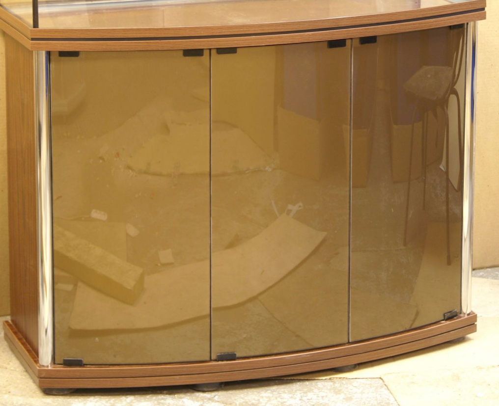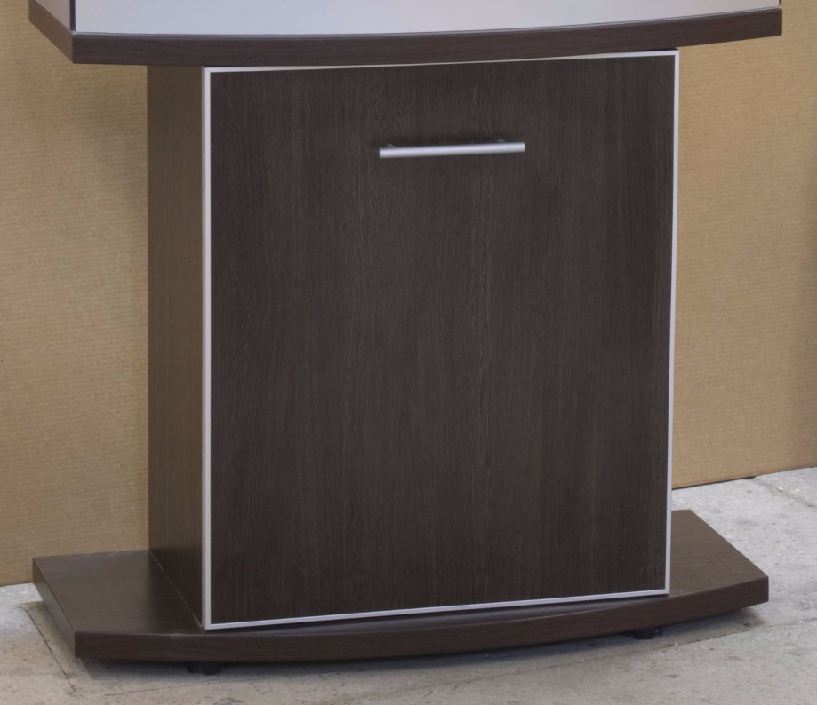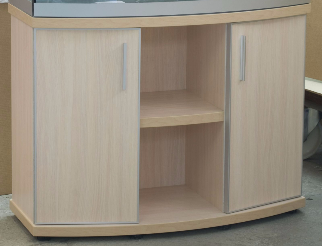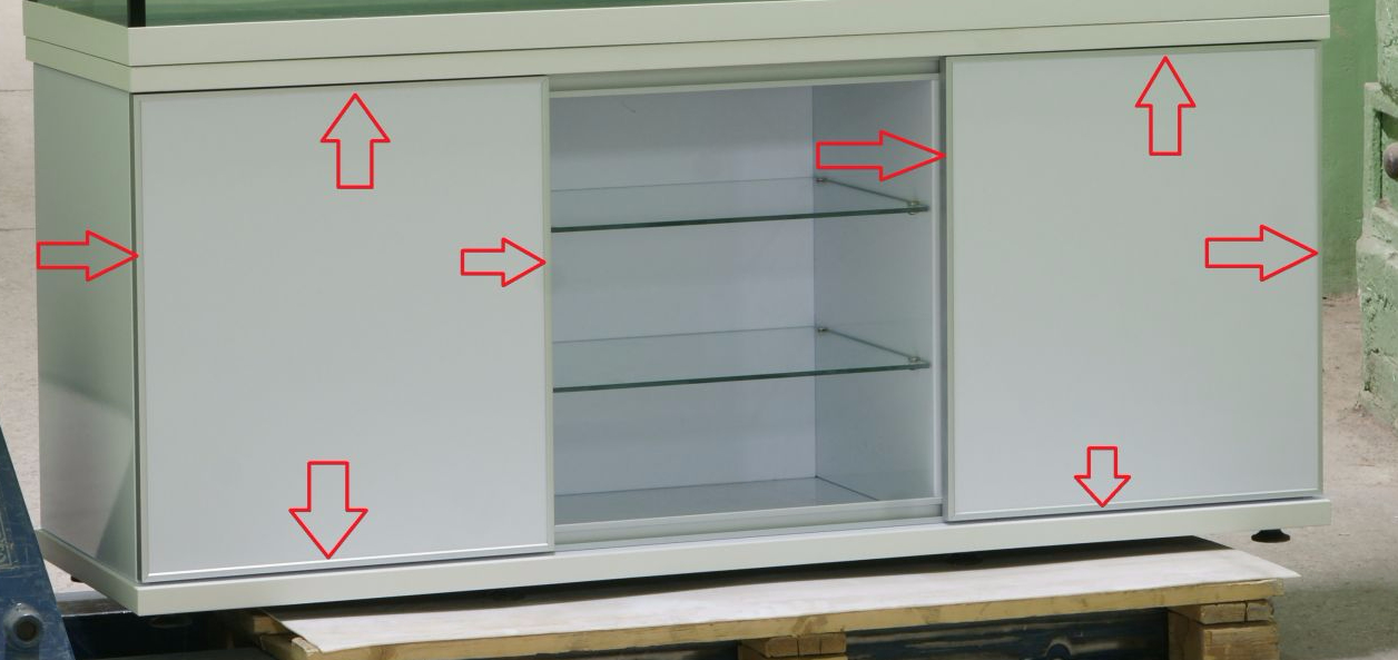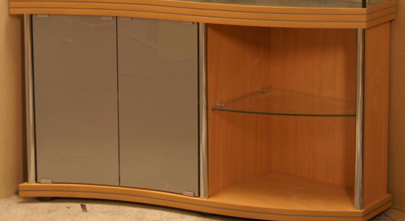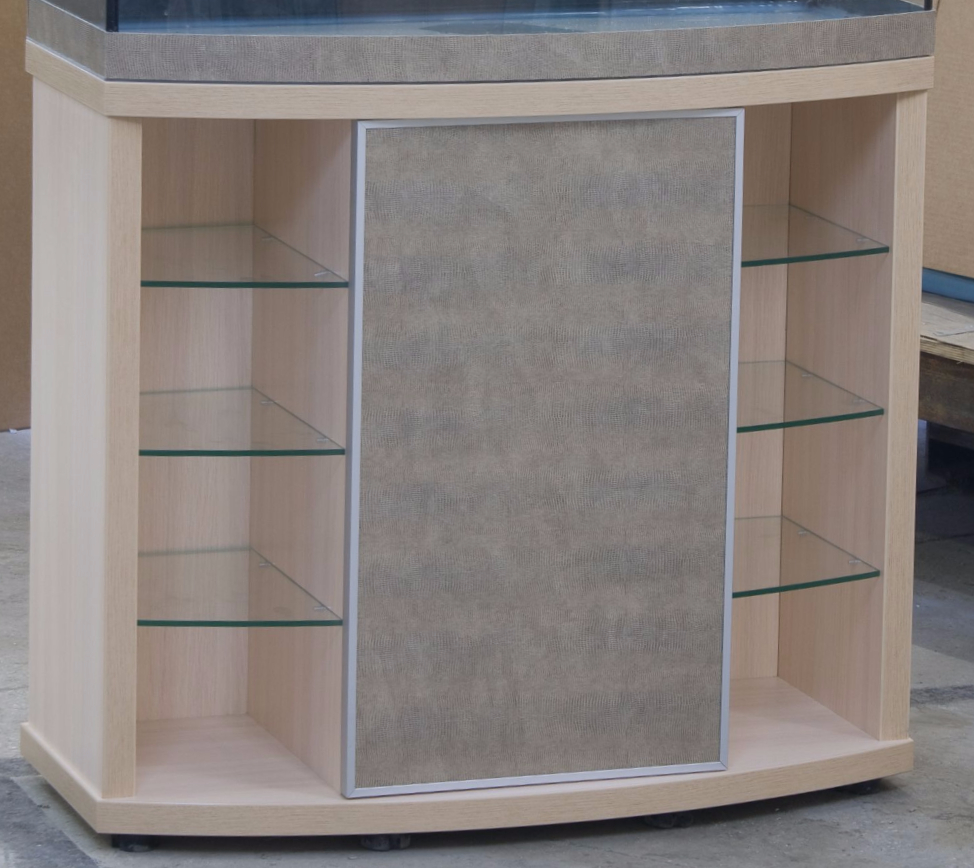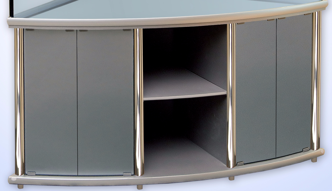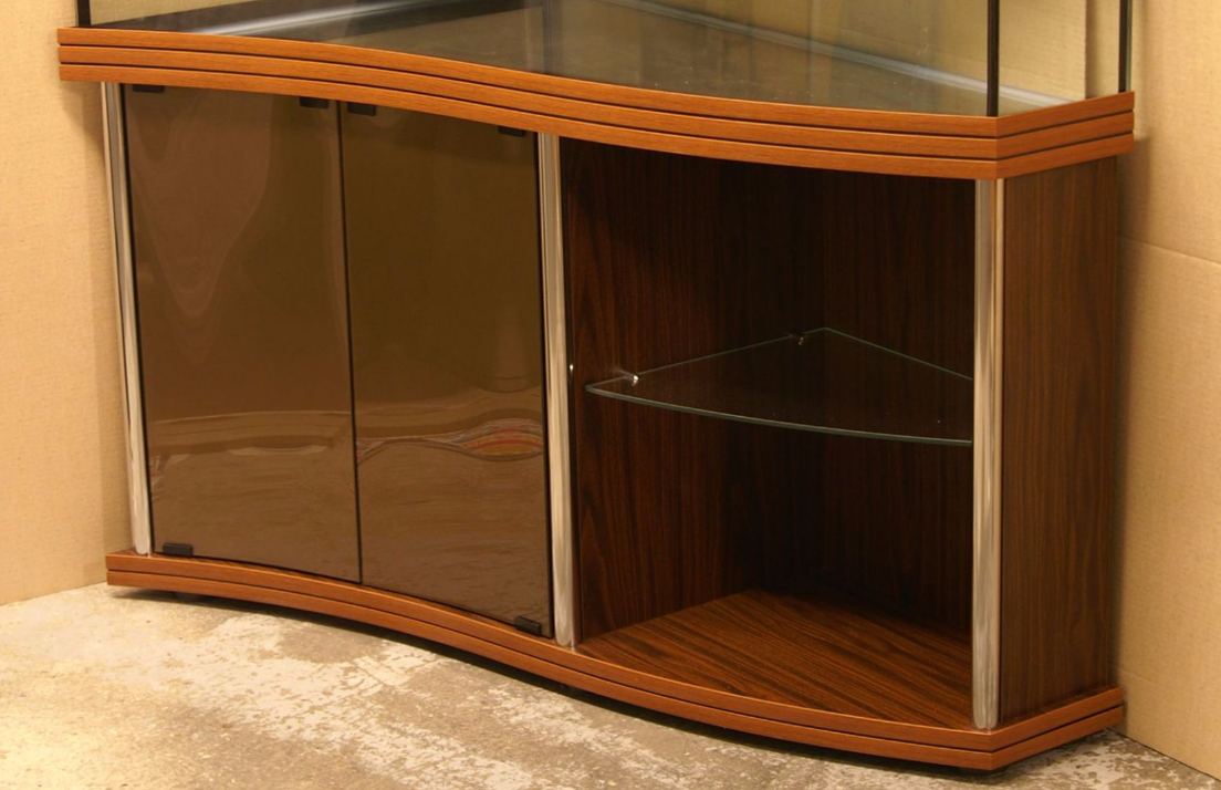 Фасады (кромки) могут иметь дополнительную отделку анодированным алюминиевым профилем (смотрите ниже). Для подставок под аквариумы с гнутым передним стеклом фасады из ЛДСП прямые, а фасады из стекла криволинейные, и имеют такой же радиус изгиба, как и стекло аквариума.
